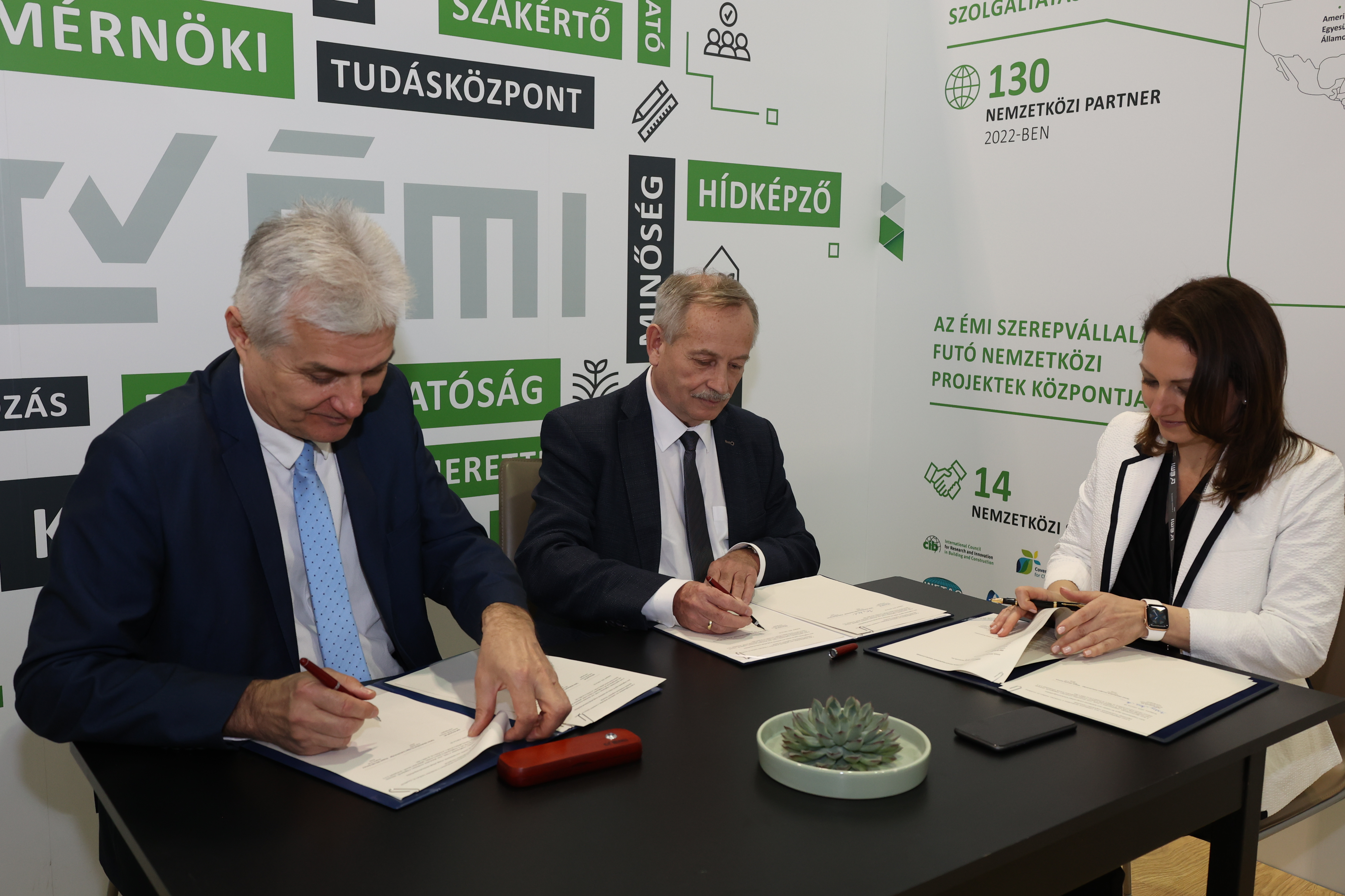 Bővítettük továbbá korábbi együttműködési megállapodásunkat a lengyel Instytut Techniki Budowlanej társintézetünkkel. Emellett szakmai megállapodást kötöttünk a szlovén társintézetünkkel, a Zavod za gradbeništvo Slovenije intézettel. Az ünnepélyes aláírást követően a társintézeteink vezetői ismertették tevékenységüket az ÉMI standjára látogatókkal.