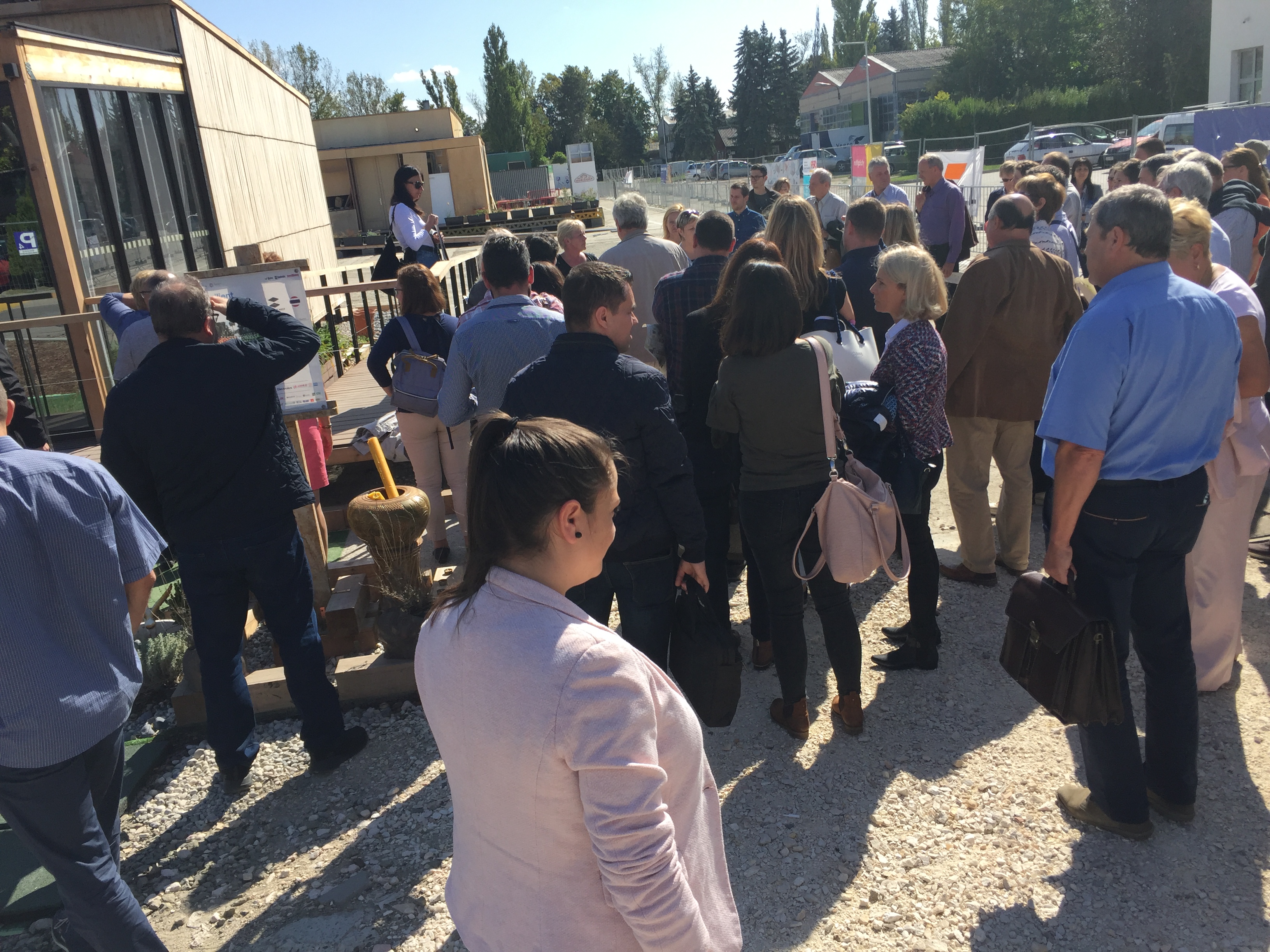 Az előadások után az építésfelügyeleti munkatársak Dr. Terjék Anita, az ÉMI senior szakértő és kutató munkatársának kalauzolásával megtekintették a „modern skanzent", a Solar Decathlon Europe 2019 nemzetközi egyetemi innovációs házépítő verseny keretében megépült tíz, nulla energiás mintaházat.