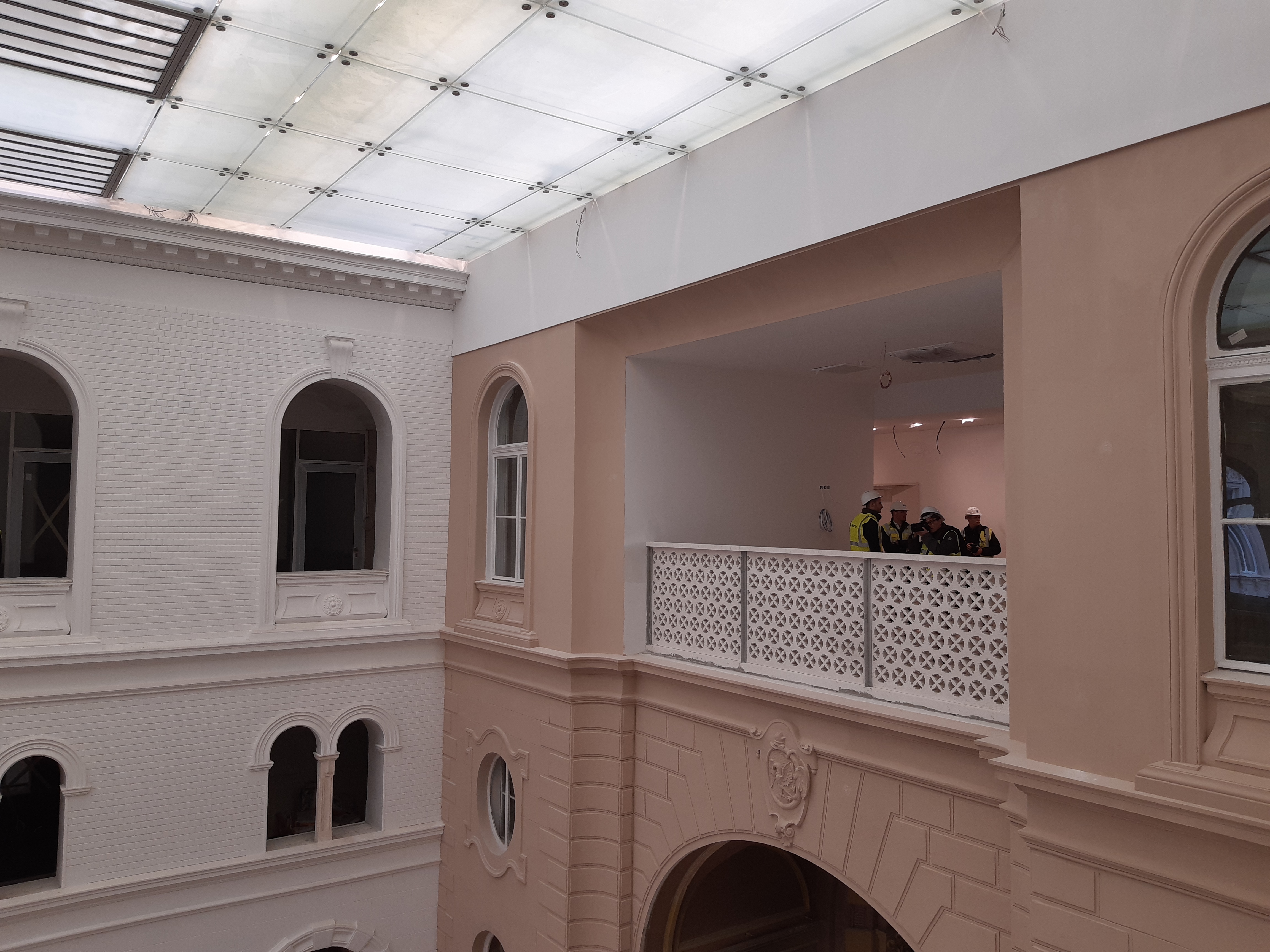 Ónodi Géza projektvezető, szakértő mérnök (ÉMI) elmondta, hogy az épületegyüttes annak idején is két részre tagolódott, a Múzeum utca felőli rész lakófunkciót látott el, valamint reprezentatív eseményeknek adott otthont, míg a Reviczky utcai szárny istálló és kiszolgálóépületeket foglalt magába. A kivitelezés során előkerültek az üvegbevilágító plafon egyedülálló eredeti acélszerkezete mellett 140 éves burkolatok, tapétadarabok és díszítő festések, valamint korabeli gépészeti elemek is.
