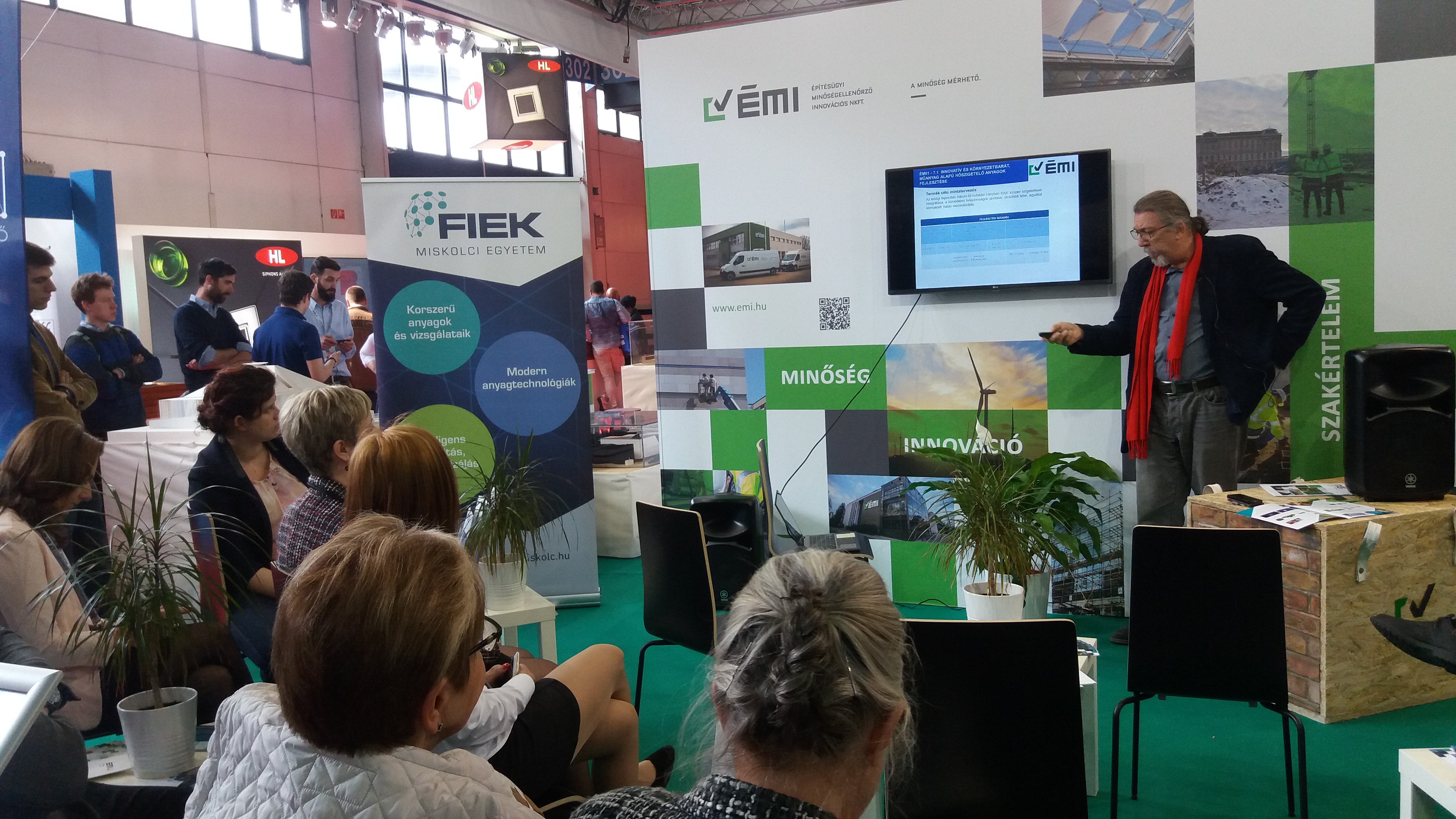 Velősy András műszaki fejlesztési mérnöki iroda vezető előadásában az ÉMI piacorientált kutatás-fejlesztési tevékenységéről, a Miskolci Egyetemmel közös projektjéről, a Felsőoktatási Ipari Együttműködési Központ (FIEK) eredményeiről beszélt. Ennek a fejlesztési együttműködésnek az első két évében három fő kutatási témával foglalkoztak: innovatív és környezetbarát, műanyag alapú hőszigetelő anyagok fejlesztésével; innovatív és környezetbarát beton szerkezeti elemek fejlesztésével; valamint innovatív anyag- és anyagtechnológiai kutatások intelligens épületüzemeltetési rendszer megalapozására témával. A kutatási projekt első mérföldköve sikerrel zárult. Az előadó ennek eredményeit ismertette.